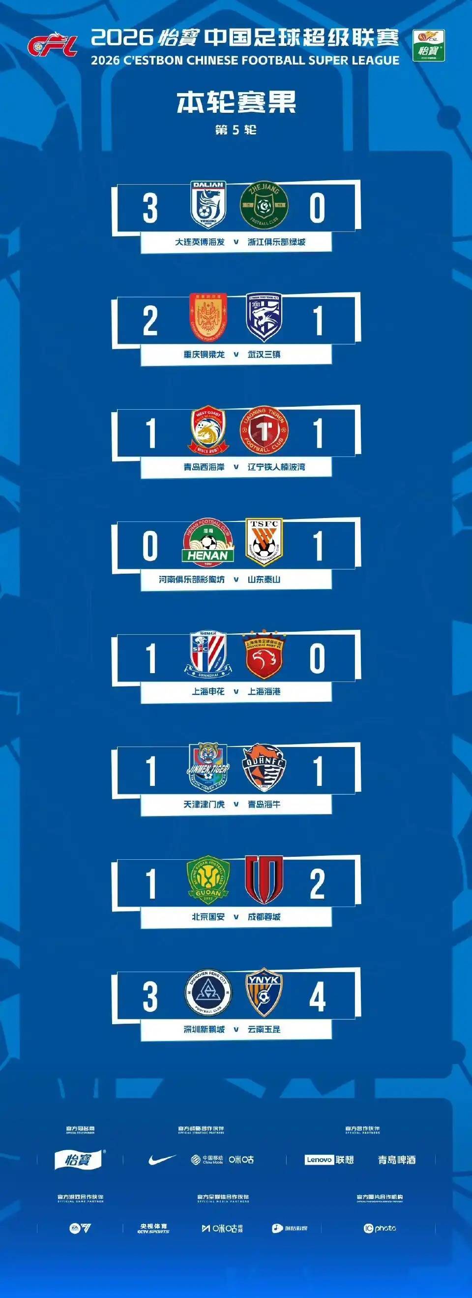 前四轮保持不败的另外两支队伍,重庆铜梁龙和上海申花本轮也延续了不错的势头,前者在主场2∶1击败武汉三镇,而后者则在备受关注的上海滩德比中笑到最后,1∶0战胜上海海港。