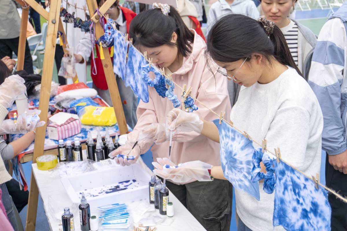 “抹黑节”摊位前,更是笑声不断。拉祜族学生陈益(2024级材料化学专业)热情地向大家介绍:“我们拉祜族有句老话,‘抹得越多,祝福越多’!”只见学生们手持彩粉,互相涂抹。斑斓的色彩在阳光下飞舞,寓意着“驱邪纳福、越抹越吉祥”的美好祝愿。