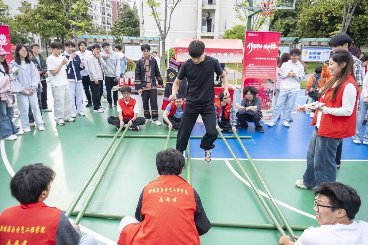 “开合!开合!开开合!”竹竿敲击的清脆节奏划破校园的宁静,黎族竹竿舞的欢快律动点燃全场热情。