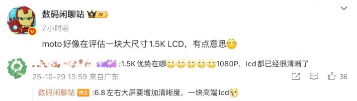 根据@数码闲聊站 爆料,联想 moto 似乎在评估一块 1.5K 分辨率的高端 LCD 屏幕,尺寸在 6.8 英寸左右。