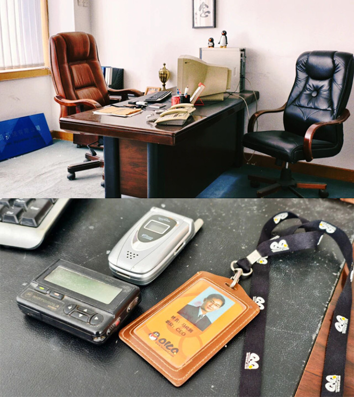 在办公室里,还保留了当年马化腾的办公位,你不仅能见到大屁股的显示器、已经从大部分家庭里消失的座机,还有翻盖手机、BP机和工牌,梦核风扑面而来。大家最熟悉的好友来消息的“滴滴滴”声音,就是马化腾亲自录的自己的BP机的声音,一代经典就从这里开始了。