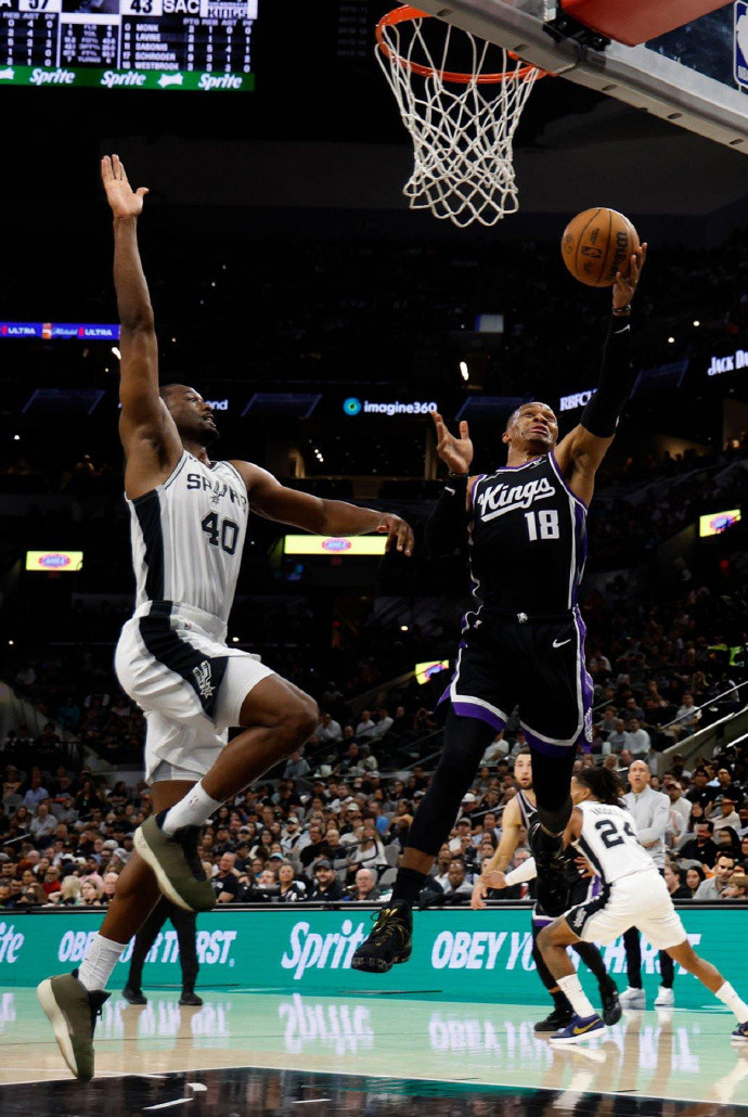 国王这边,全队也有5人得分上双。德罗赞表现出色,十分高效,出场39分钟,投篮15中12,三分球1中1,罚球2中2,空砍27分2篮板4助攻2抢断的数据,正负值-23。小萨博尼斯出场36分钟,14投7中,三分1中0,罚球4中3,拿到17分13篮板5助攻3抢断的全面数据,正负值-7。